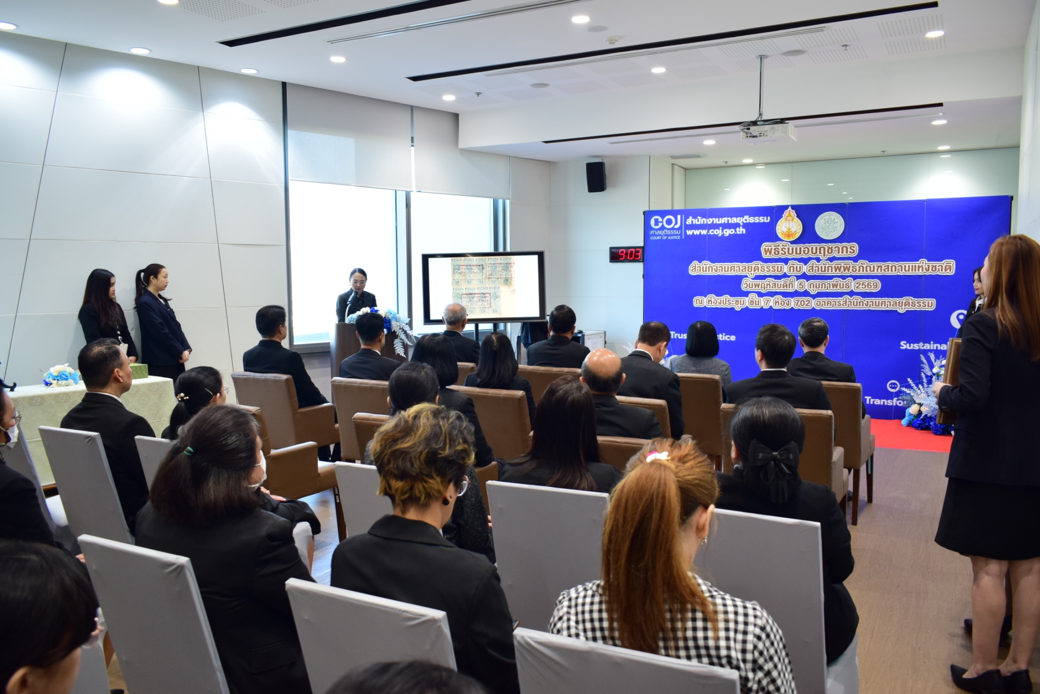 วันที่ ๕ กุมภาพันธ์ ๒๕๖๙ เวลา ๐๙.๐๐ น. สำนักงานศาลยุติธรรม โดยศูนย์วิทยบริการศาลยุติธรรม จัดพิธีรับมอบฤชากร ระหว่างสำนักงานศาลยุติธรรม กับสำนักพิพิธภัณฑสถานแห่งชาติ โดยมีนายไกรสร โสมจันทร์ ผู้พิพากษาศาลอุทธรณ์ประจำสำนักประธานศาลฎีกา ผู้แทนสำนักงานศาลยุติธรรม เป็นผู้รับมอบ และนางสาวนิตยา กนกมงคล ผู้อำนวยการสำนักพิพิธภัณฑสถานแห่งชาติ เป็นผู้ส่งมอบ